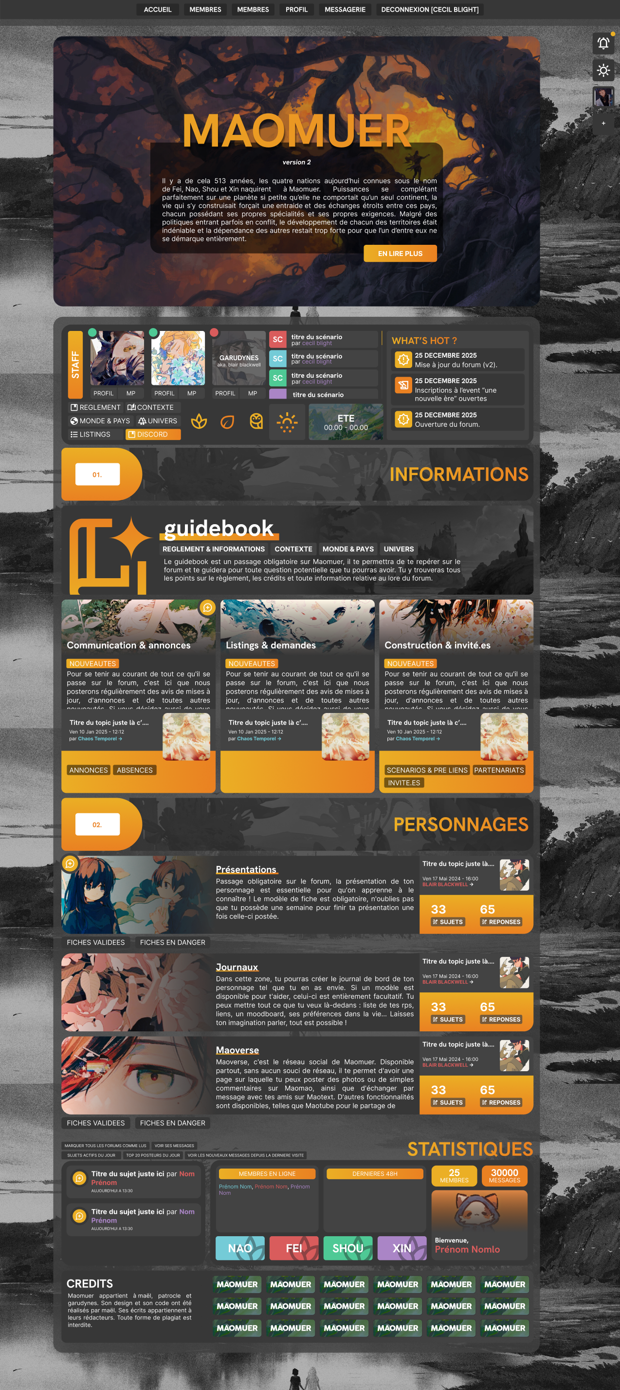 Projet personnel, Maomuer est un forum RPG écrit ayant pour but de permettre à de nombreuses personnes de partager des moments en développant leurs personnages ensemble.